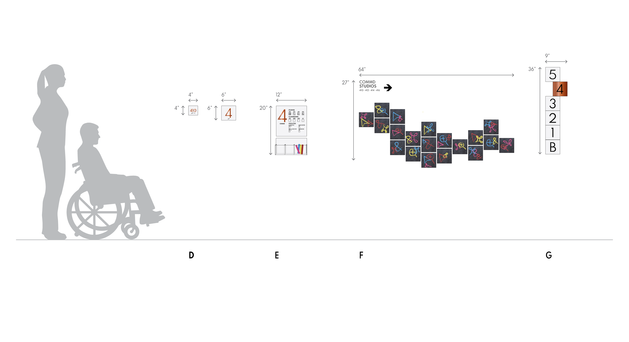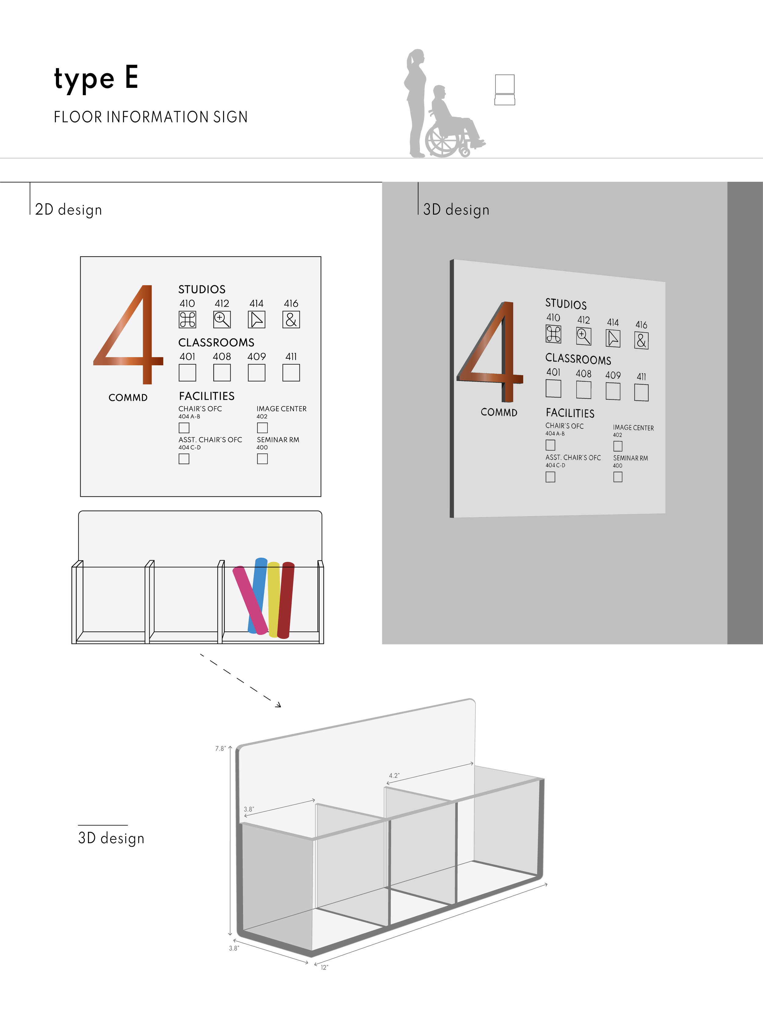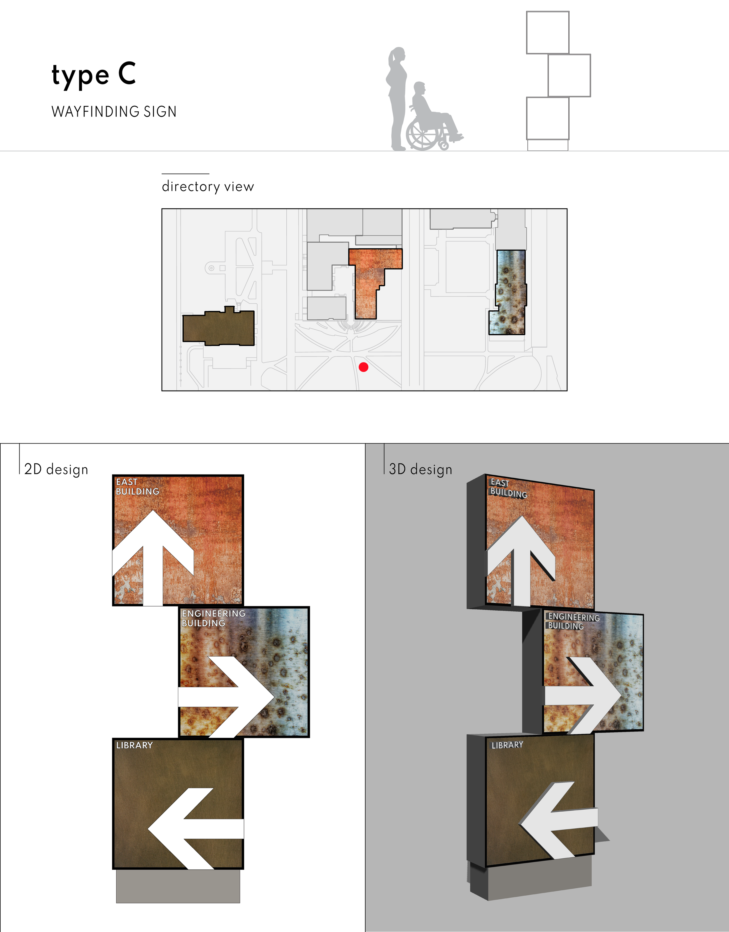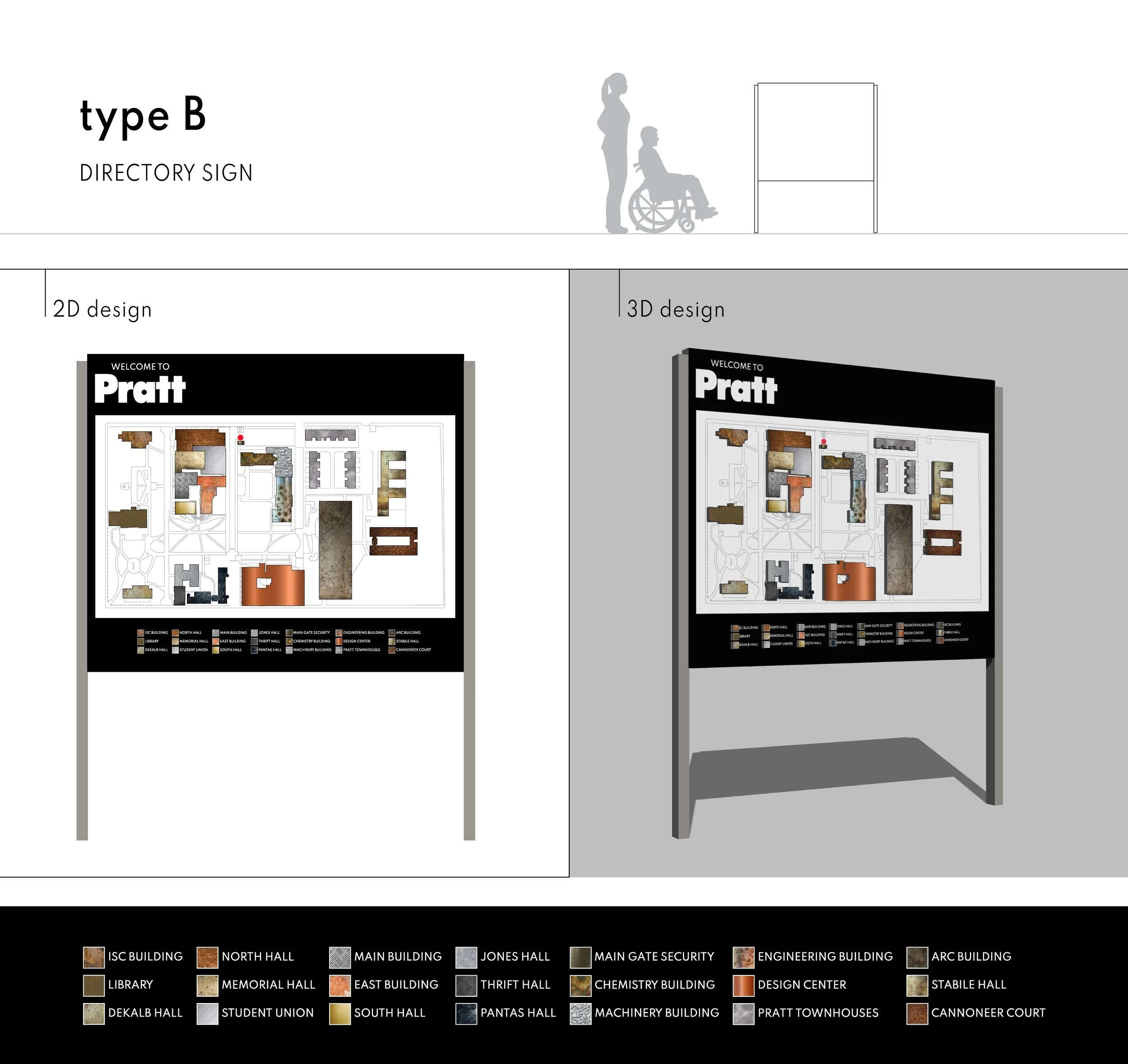 Pratt campus is made up of an assortment of historic buildings and more contemporary additions. Due to some buildings dating back to 1887, not all of the buildings have proper exterior signage. Each building is assigned their own type of metal. The metal that is used for the destination sign (18A) and the wayfinding signage (18C). This aids in distinguishing one building from another, as well as providing a visual to search for, not just the building name.